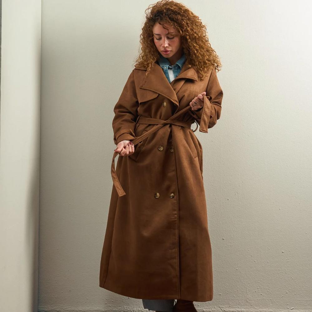 ترنش كوت طويل من قماش السويد الرائج مع حزام
